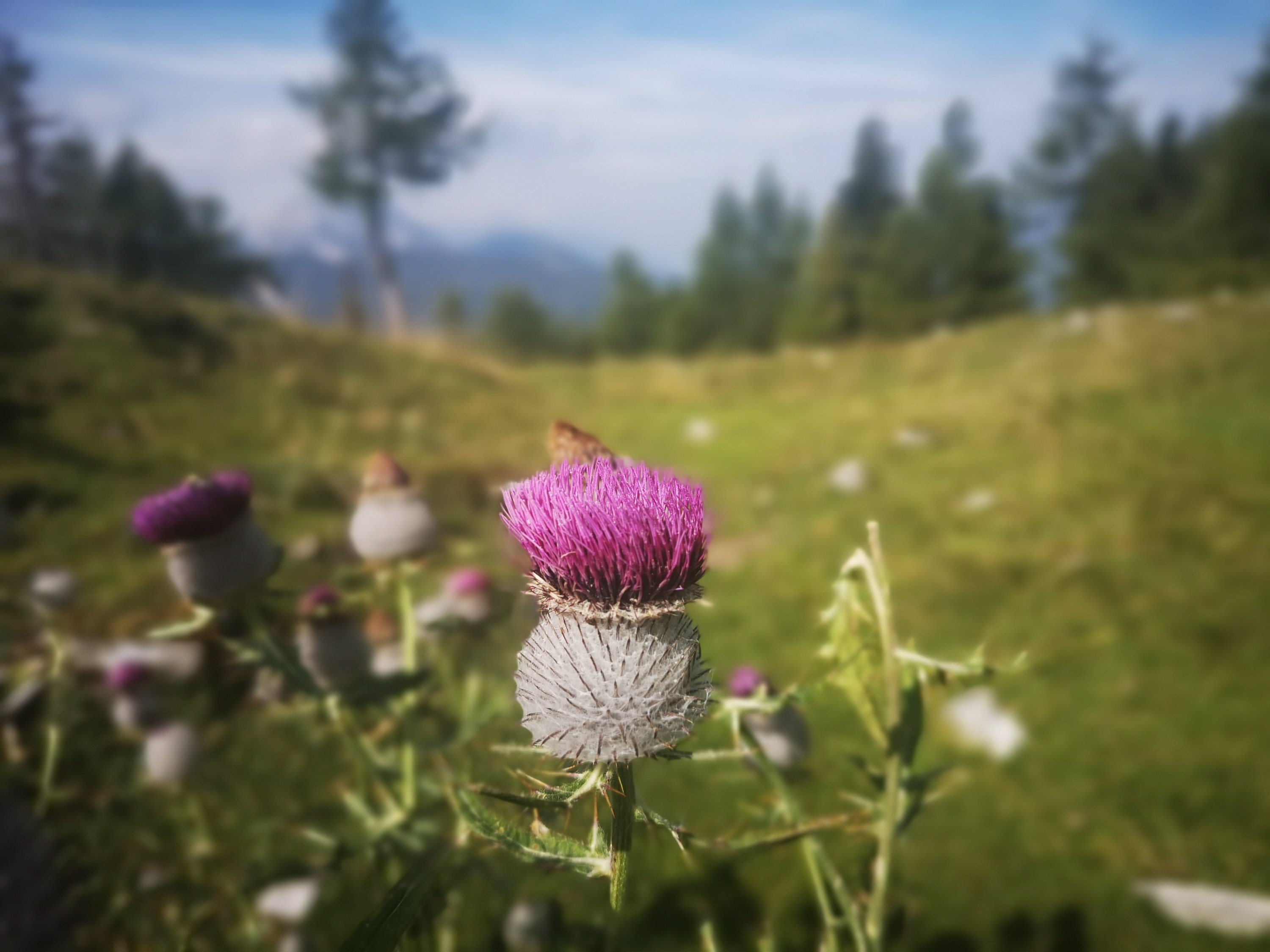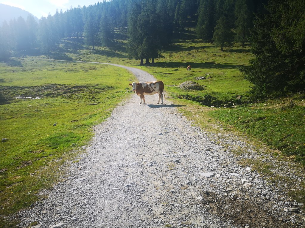 Ich kämpfte mich durch den Wald, und kam, durch rot-weiße Markierungen geführt, an einer Kuhwiese heraus. Bei der Fahrt mit dem Wandertaxi hatte die Wanderführerin erzählt dass die Kühe schon abgetrieben wurden, und nur noch die Jungbullen auf der Alm sind. Und der italienische Jungebulle mochte mich offesichtlich nicht. Er kam in meine Richtung und schnaubte mich an.. (Sorry hier gibts keine Fotos, ich versuche mich da in Zukunft zu verbessern.)
