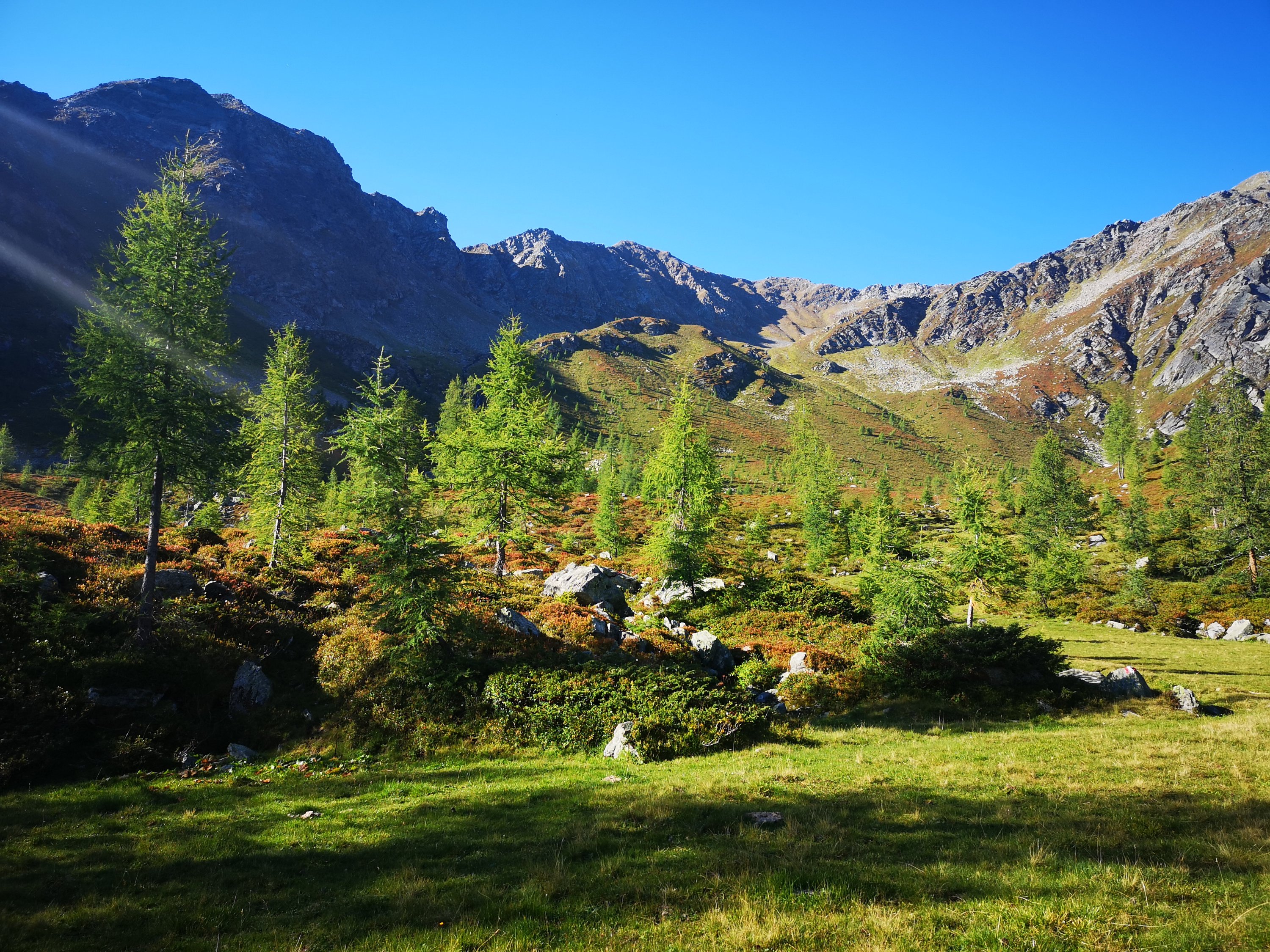 In der Früh startete ich mit Nora Richtung Feldnerhütte. Da Noras Handy kapuut war, und die Route sehr wenig begangen ist (bis zur Hütte trafen wir 3 Personen) gingen wir den Weg gemeinsam.